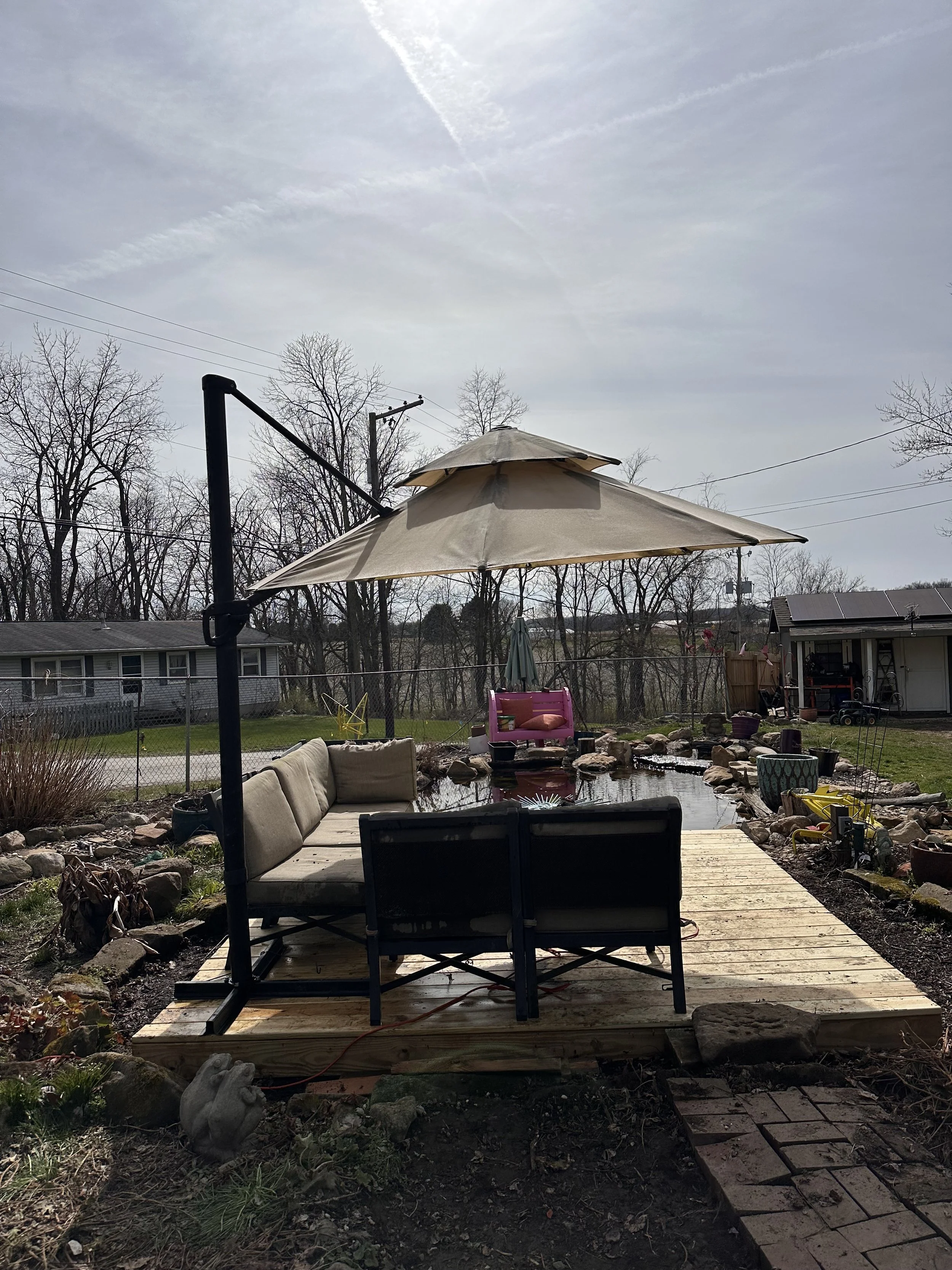Mostly cosmetic today, figuring out how to add a second corner to the couch (build table to hide umbrella legs, in progress), and fighting with outdoor umbrella mildew from hell.