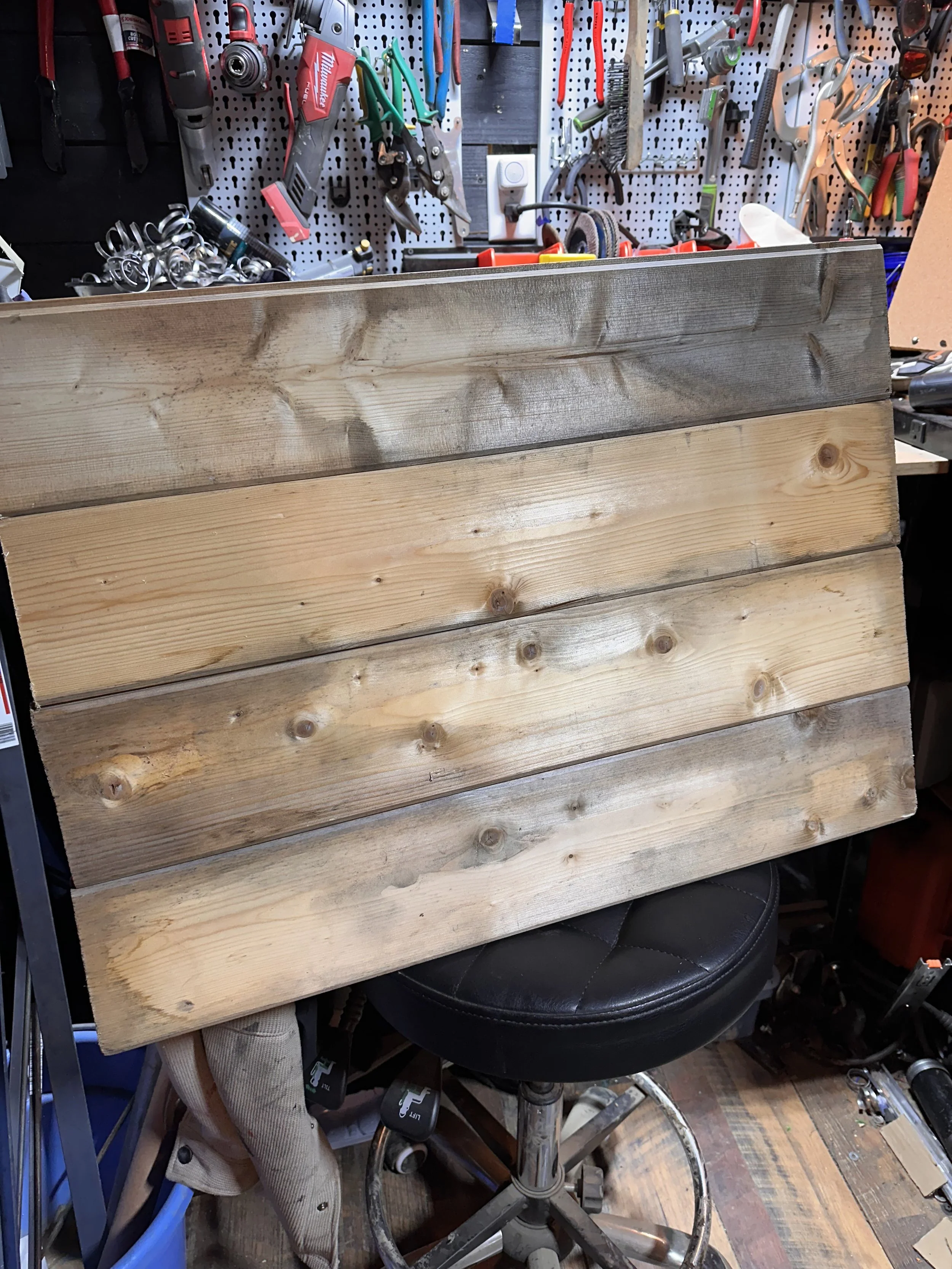 Still a work in progress, but I spent most of today building a new backdrop for metalwork photos. Wanted something more “Shed-day”: tried The Shed’s black walls, but open wall-space is in limited supply. Fortunately I still had some pieces of shiplap left over from building The Shed’s interior…