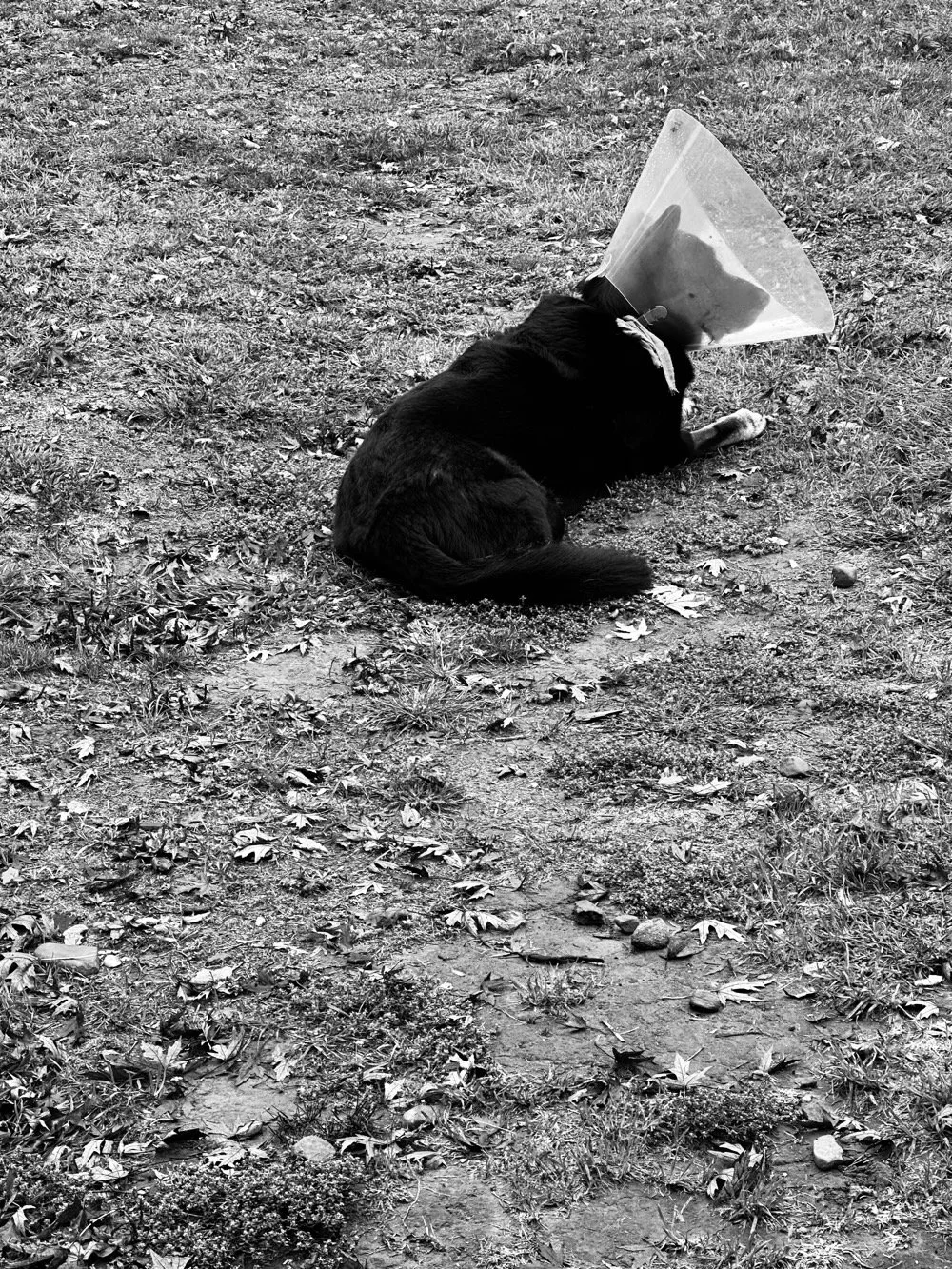 Heading into the last five+ of Kirby's 72-hour enconement and I'm all set with having a cone jammed behind my knees. At least it doesn't knock me over anymore (thank you, yoga balance). As for Kirby, he's doing fine. No complications from surgery (right side canines, upper and lower were removed), and everything is healing up nicely. He's digging the soft food that he's on for the next 11+ days – as are the smaller yet larger dogchildren girlz (no meal is now complete without them getting the can scrapings in their dry tidings you scurrolous heathen you). Another three+ weeks until he's allowed hard chew toys (which got us into this mess in the first place and which he probably won't be getting back) and then we start the process all over again the first week of November, when the left side canines come out and Coneholio returns for a soft-food, knee-bashing encore.