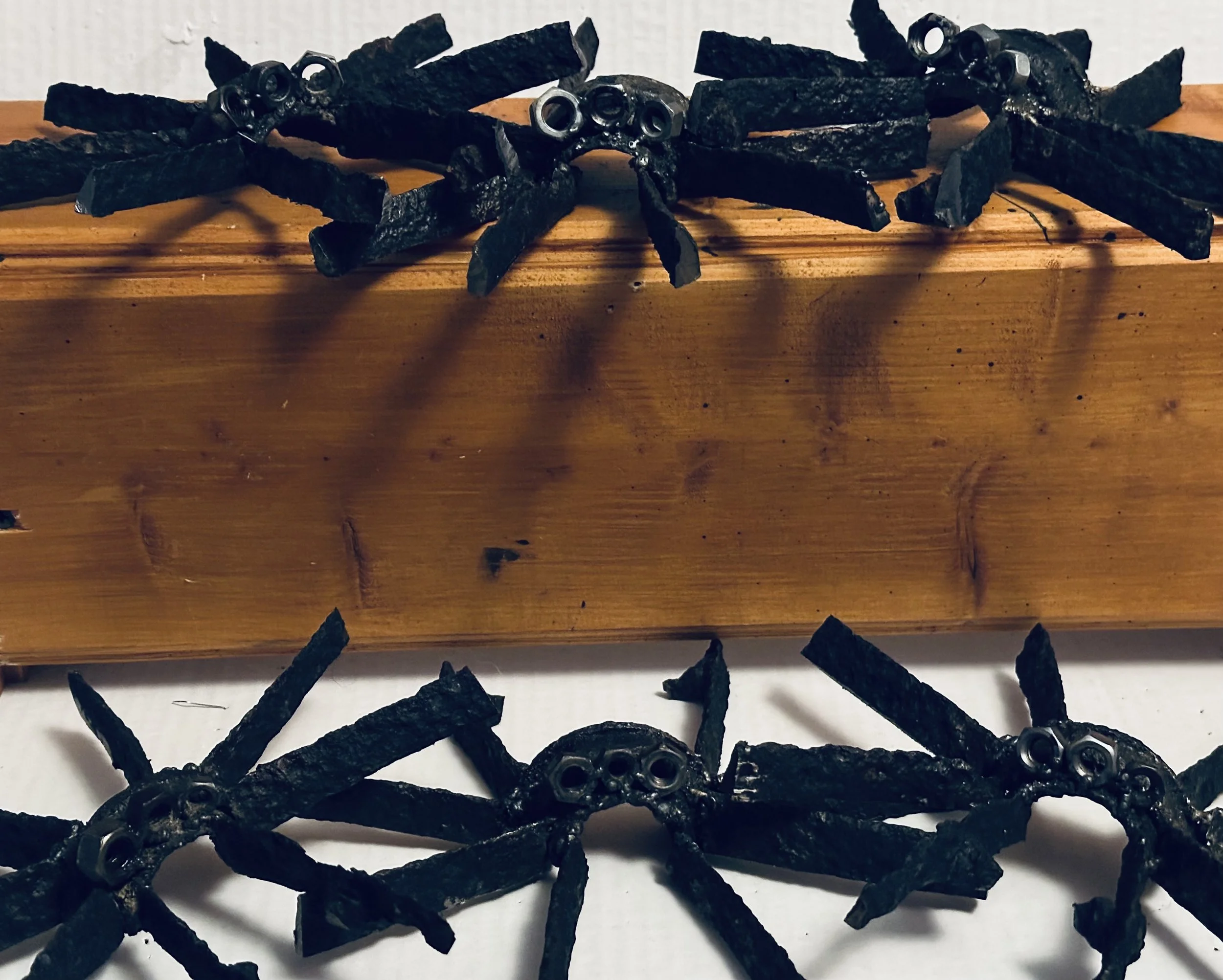 Finished this project a few weeks ago, but with these Christmas spiders now in familial hands, I can share. Crafted them from a rust-eaten carriage wheel that spent most of its life leaning against the woodshed at my grandparents’ place as a memento of ye olde homestead; the eyes are from hex nuts found in their basement. My grandfather was a biology professor and spider expert/otaku, hence the arachnid final form. Wanted to add turquoise, as my grandmother was an insanely brilliant silversmith, but I, alas, am not.