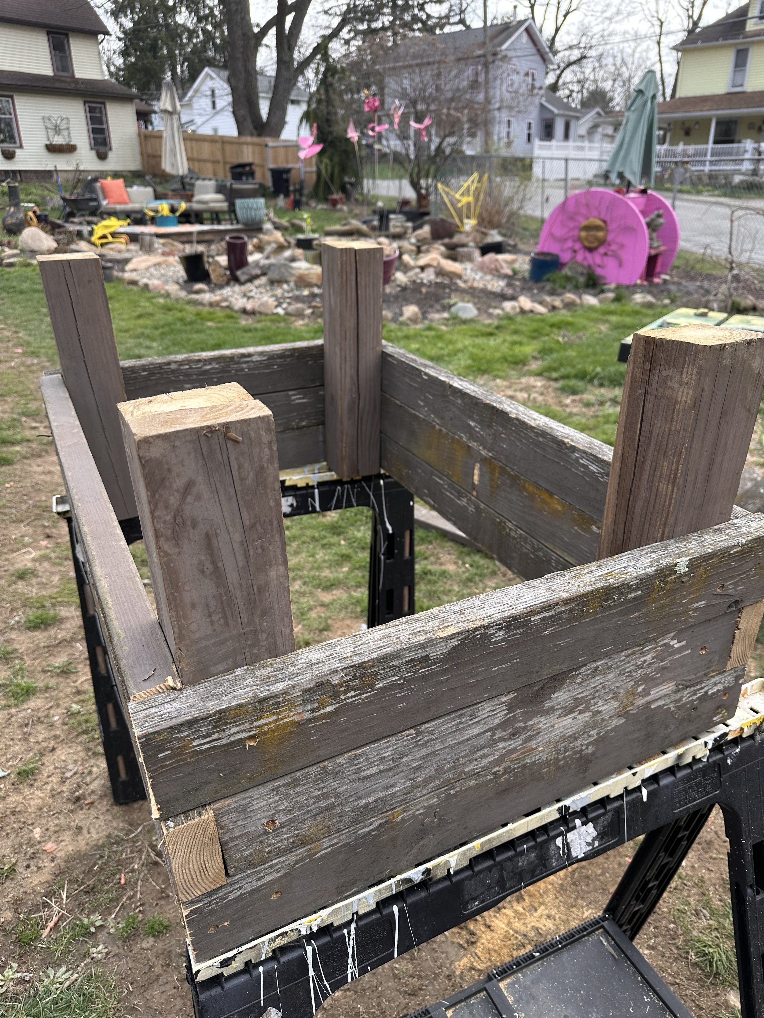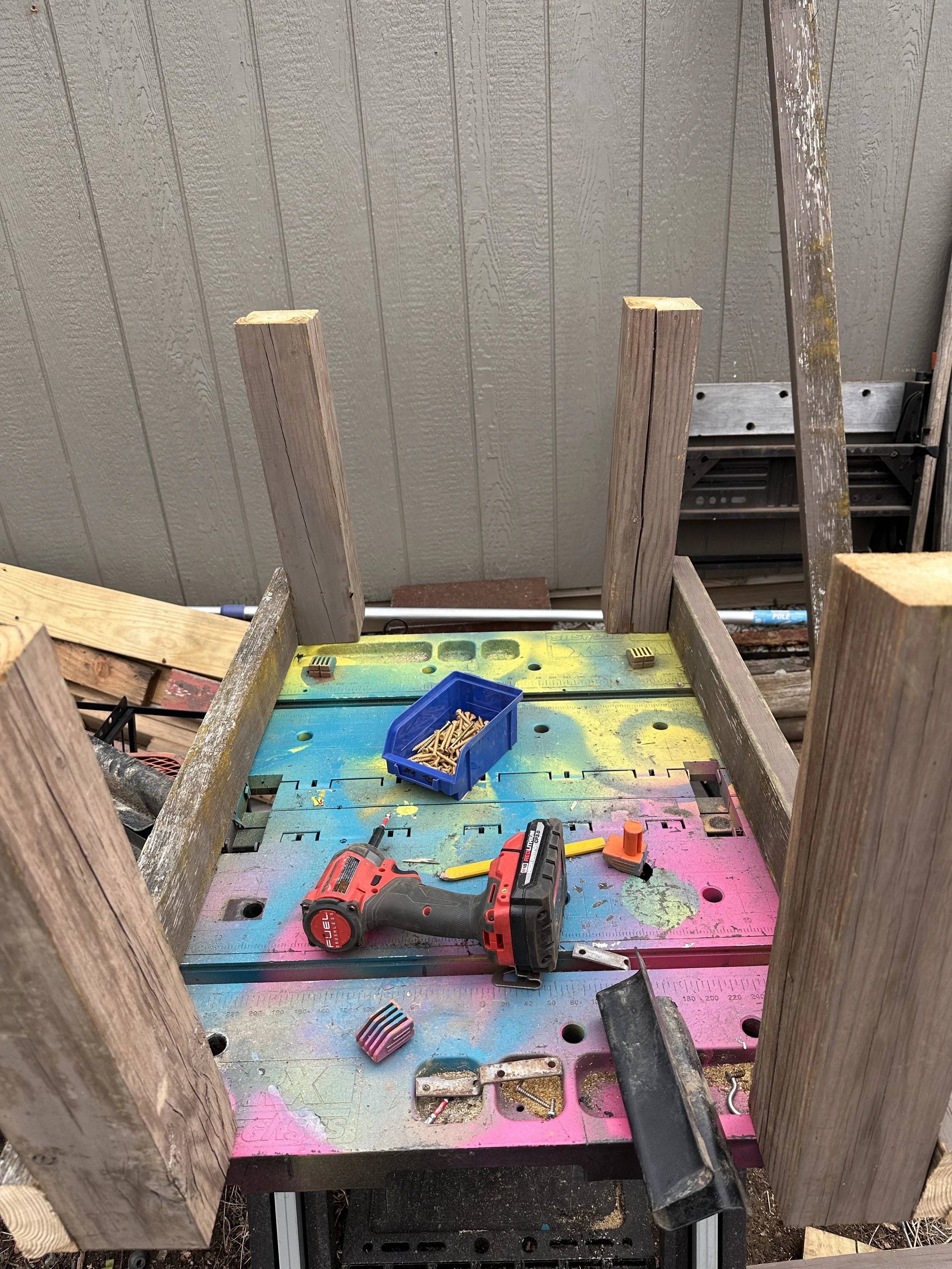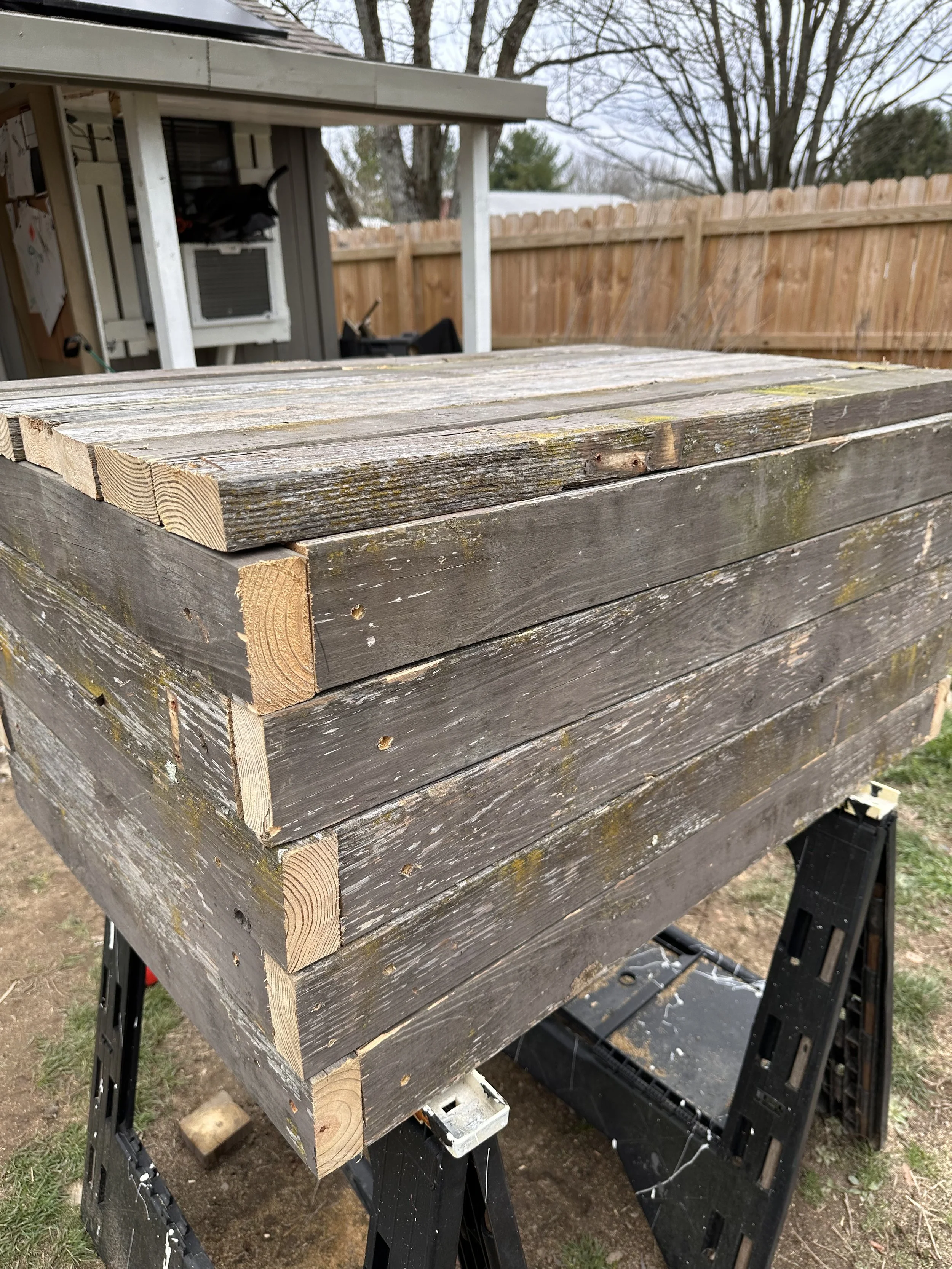 Was worried that I’d be staring down another rained-out day of zilch, but managed to finish the Pondio table. With the exception of two boards, the entire thing is made out of the pergola my grandfather and I built (and that K and I were married under) that I took down to make way for Pondio. The original paint and stain and gunk remains on the inside of the piece. Pleased with how it turned out.