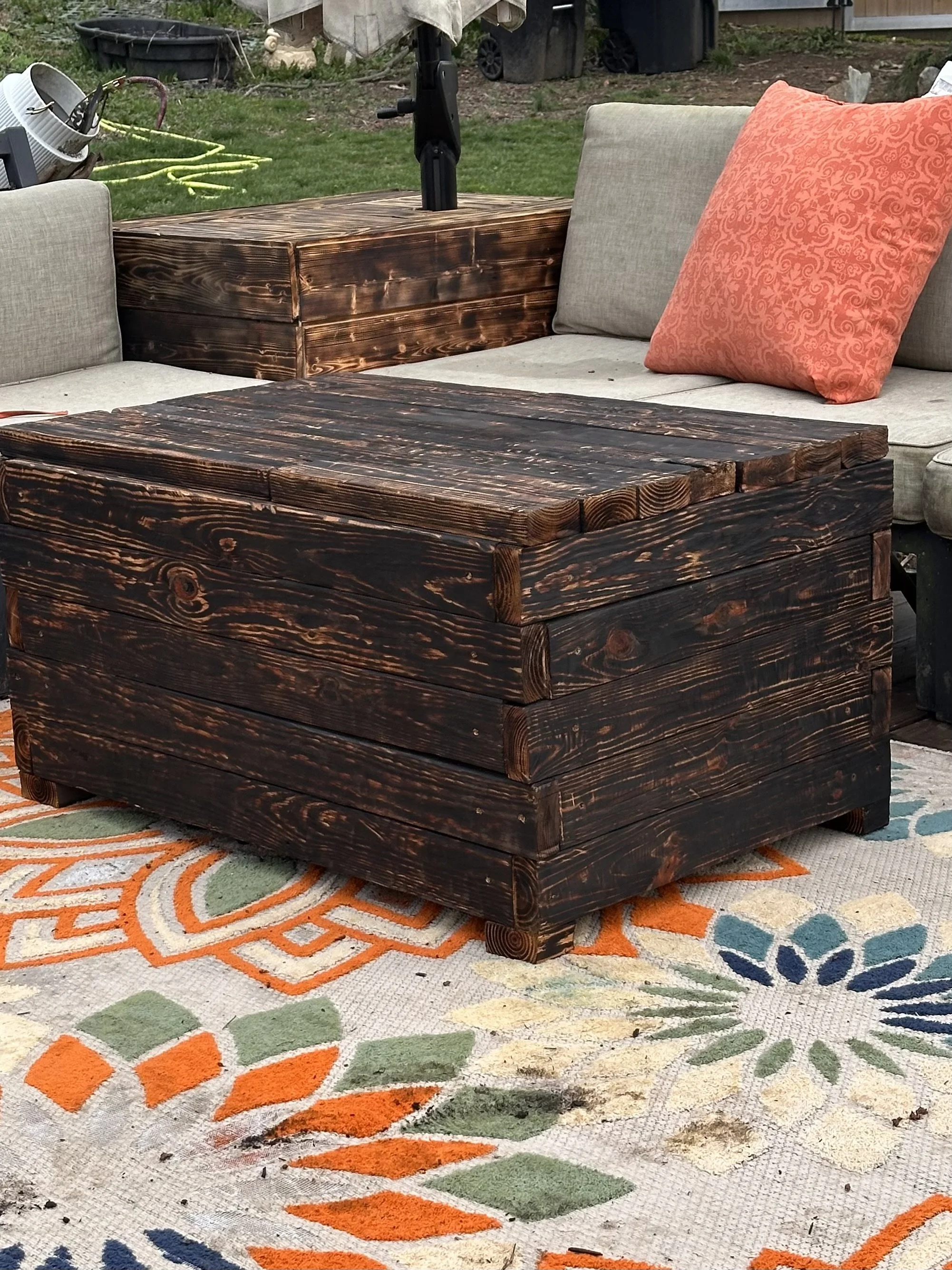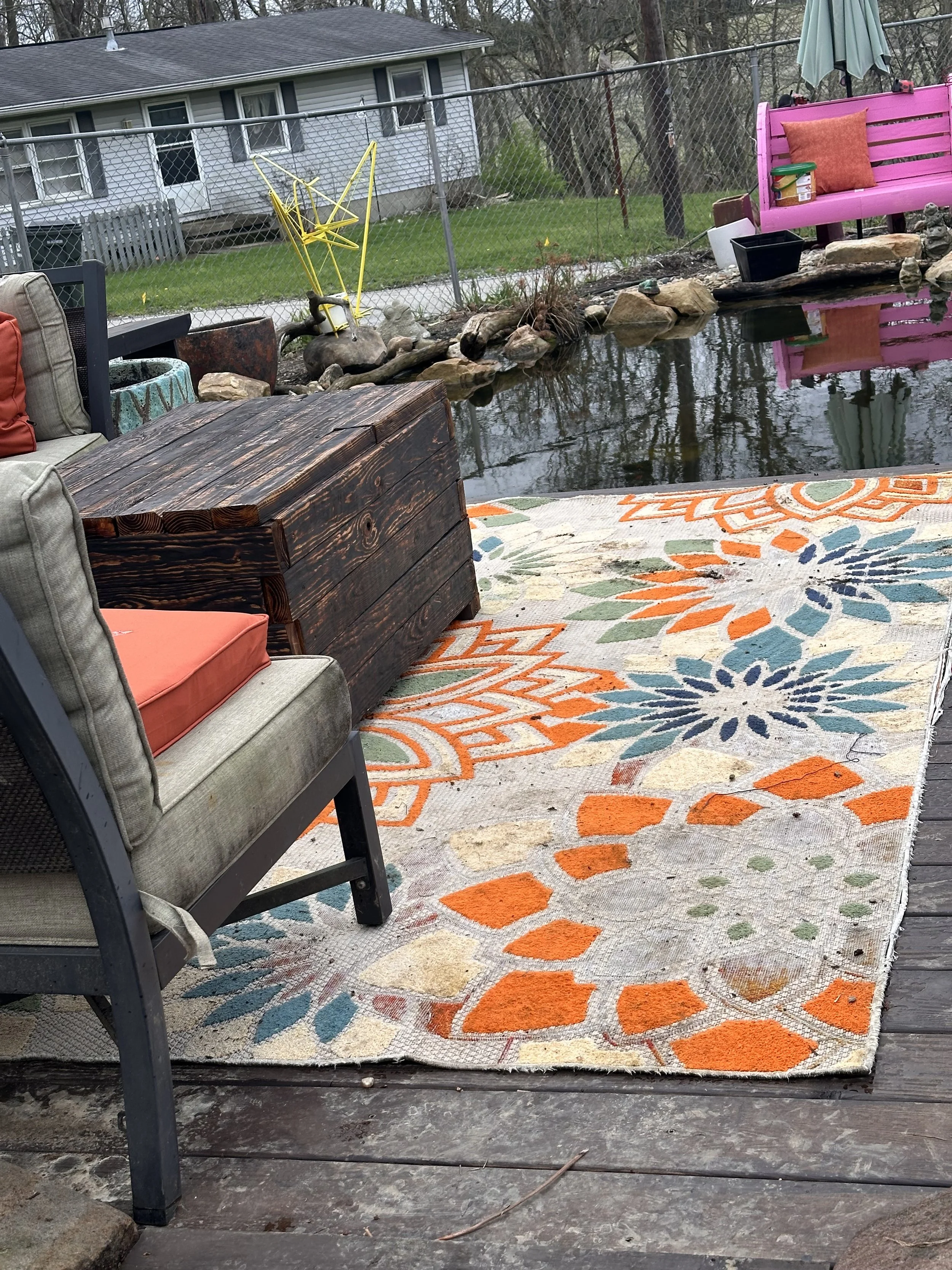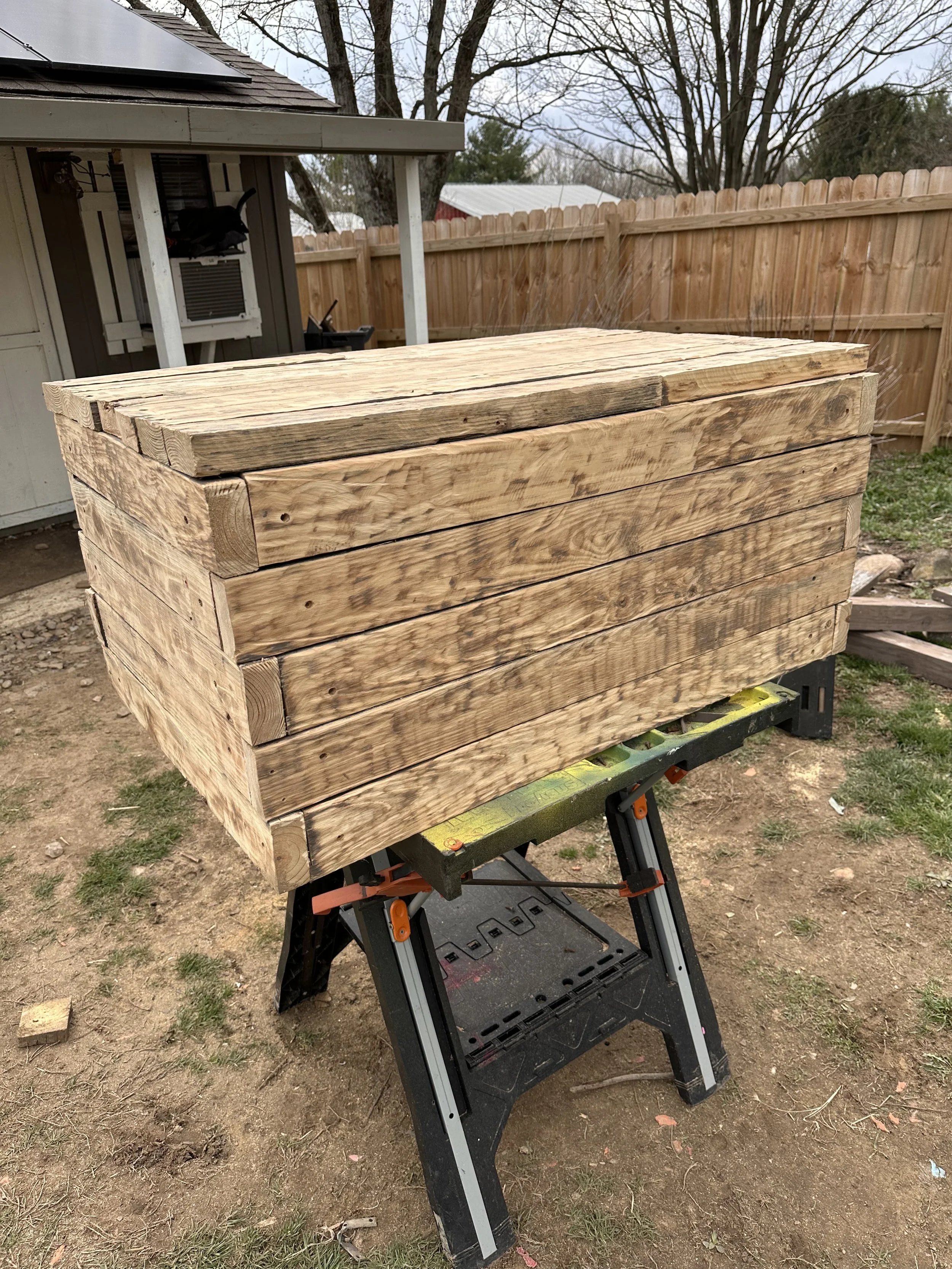 Was worried that I’d be staring down another rained-out day of zilch, but managed to finish the Pondio table. With the exception of two boards, the entire thing is made out of the pergola my grandfather and I built (and that K and I were married under) that I took down to make way for Pondio. The original paint and stain and gunk remains on the inside of the piece. Pleased with how it turned out.